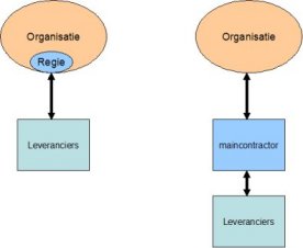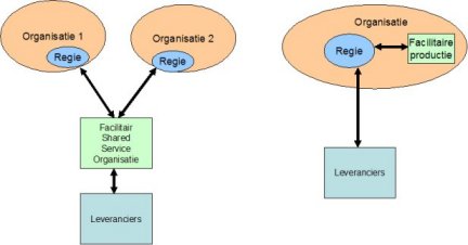 Er zijn organisaties die gezamenlijk een shared service-organisatie oprichten en daarbinnen de productie opnemen. De afzonderlijke organisaties zijn dan klant bij deze shared service-organisatie. Die maakt op haar beurt de afspraken met de leveranciers (variant 1).